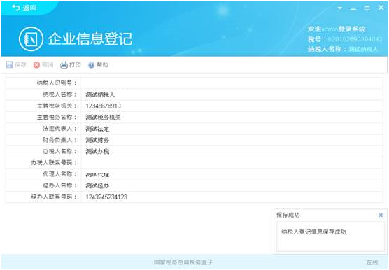 登记信息页面用户可以对企业信息进行修改、查看帮助文档等操作,企业信息包含纳税人识别号、纳税人名称、主管税务机关、主管税务机关名称、财务负责人、办税人名称、办税联系号码、代理人名称、经办人名称、经办人联系号码等信息。