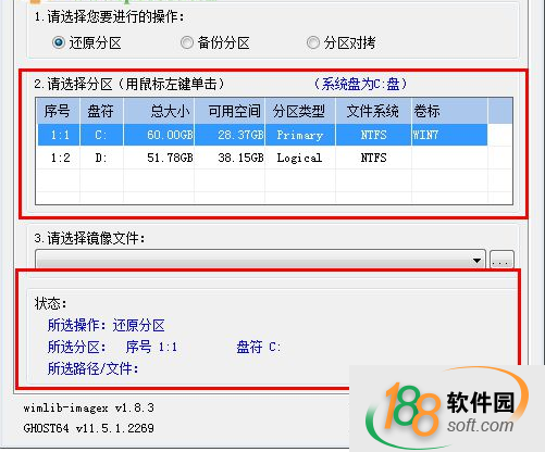 2、选择您需要进行使用的分区,包括了序号、盘符、总大小、可用空间、文件系统、可对您需要使用的镜像文件进行选择、软件的状态查看等;