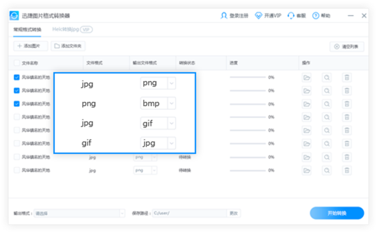 用户可添加单个或批量图片至文件列表,设置好想要转换的格式进行转换;本功能支持转换JPG、PNG、BMP、GIF等多种格式;转换后的图片保持原画高清画质。