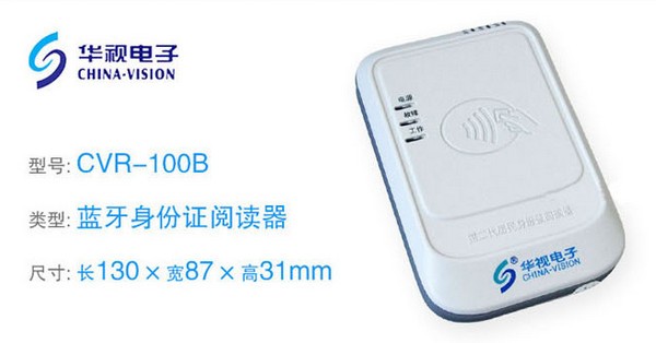 华视CVR-100B是蓝牙型身份证阅读器,该设备符合ISO14443 Type B国际标准,采用无线传输方式,读取第二代身份证内信息。华视CVR-100B配备高性能PDA作为服务终端,与核查设备通过蓝牙连接高速无线的联机作业,PDA通过订制的应用程序除读取身份证信息外,还具有信息保存,查询,导出,上传,后台比对等功能等功能。PDA采用高质量触摸彩色显示屏,轻松实现软件功能的各项操作。内置可充式高能锂电池,保证在无外接电源情况下,也能长时间连续工作。该设备体积小巧,操作简便,可灵活应用于公安,民政,银行,宾馆,邮局,证券等场所进行身份证核验。