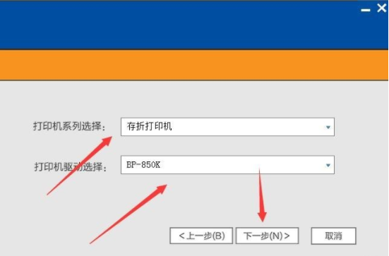 3、选择打印机系列‘存折打印机’和打印机驱动‘BP-3000II’,点击下一步