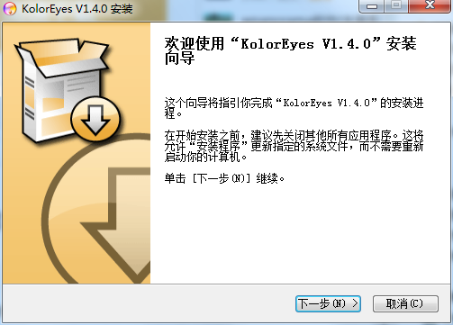 1、在华军软件园将KolorEyes全景视频播放器下载下来,并解压到当前文件夹中,点击其中的.exe应用程序,进入安装向导界面,接着点击下一步。
